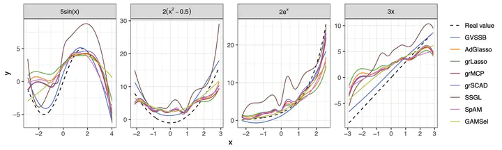 GVSSB outperforms other methods in spline fittingWe propose a parameter-expanded Coordinate-Ascent Variational Inference algorithm for high-dimensional linear regression models with grouped variables under spike-and-slab priors. This approach provides a variational Bayes approximation that is computationally more efficient than classical methods. Theoretically, we establish conditions for a more general class of spike-and-slab priors under which contraction rates can be derived for both the true posterior distribution and its variational approximation. Several existing theoretical results can be viewed as special cases of this framework. The methodology and theoretical results are further extended to additive models. Simulation studies and real-world applications demonstrate the proposed method’s superiority over existing approaches in both variable selection and parameter estimation. The implementation can be found at https://github.com/HowardGech/GVSSB.